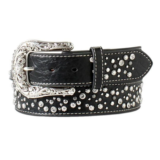 The “Rhinestone Studs” leather belt by Ariat is made of full grain leather accented by rhinestone and silver studs.