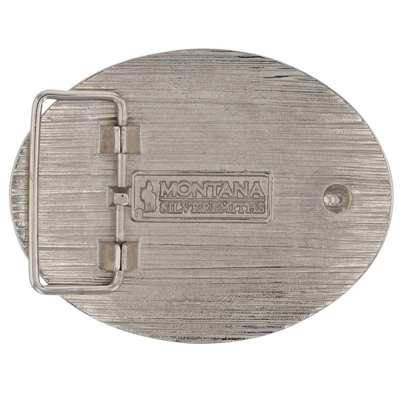 Made in collaboration with the Cowboy Sh*t company, this buckle features bold colors and a fun design. The silver tone buckle features an eye-catching yellow painted center background with a bull rider caricature in the center in blue, red, and white paint. Gold tone embellishments and letters reading “Cowboy Sh*t” complete the design. Standard 1.5 inch swivel.